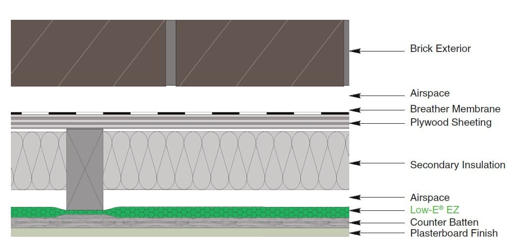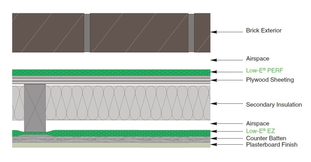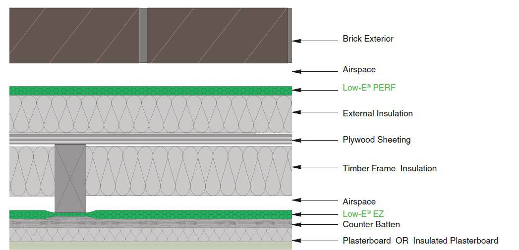 In this example a rigid foam is installed between the studs with a second layer (unbridged) installed on the exterior side of the timber frame, faced with Low-E PERF. Low-E EZY Seal is then installed on the interior face of the frame, before counter battening. Another option is to use an insulated plasterboard. This creates a second unbridged layer of insulation. This will also reduce the amount of insulation required between the studs.