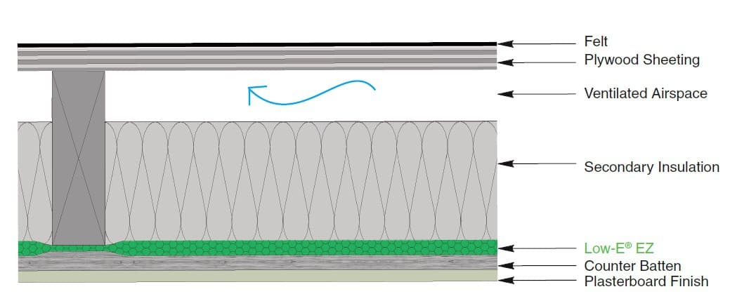 When installing a Mineral Fibre between joists, it is not very easy to maintain air spaces on both sides of Low-E. In this example, Low-E has been installed with a full fill of Mineral Fibre between the joists and Low-E EZY Seal installed below the joists before being counter battened, and the finished ceiling is installed.