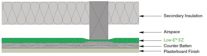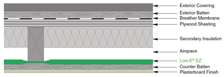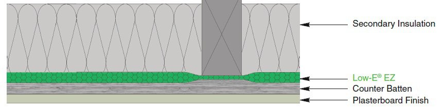 In this example, Low-E EZY Seal is installed on the underside of the rafter, with a full fill of the secondary insulation between the rafters, before counter battening and the finished ceiling is installed.