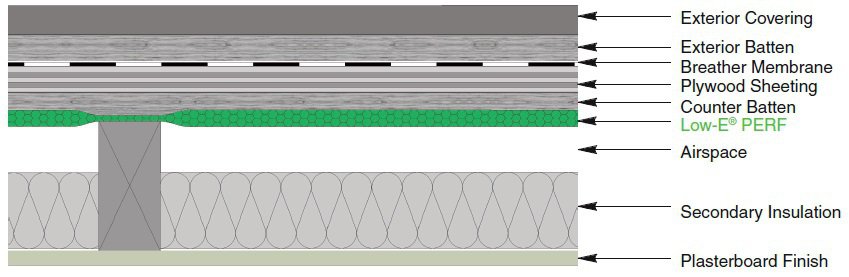 In this example, Low-E PERF is installed over the rafters with a secondary insulation between the rafters before being counter battened and a breather membrane installed.