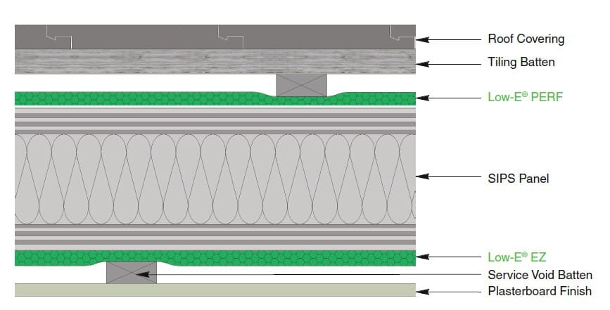 Low-E EZY Seal and Low-E PERF can be installed to replace the vapour barrier and breather membranes that are usually installed on a SIPS roof. This increases thermal performance and reduces the buildings running costs without adding any labour steps to the build process .