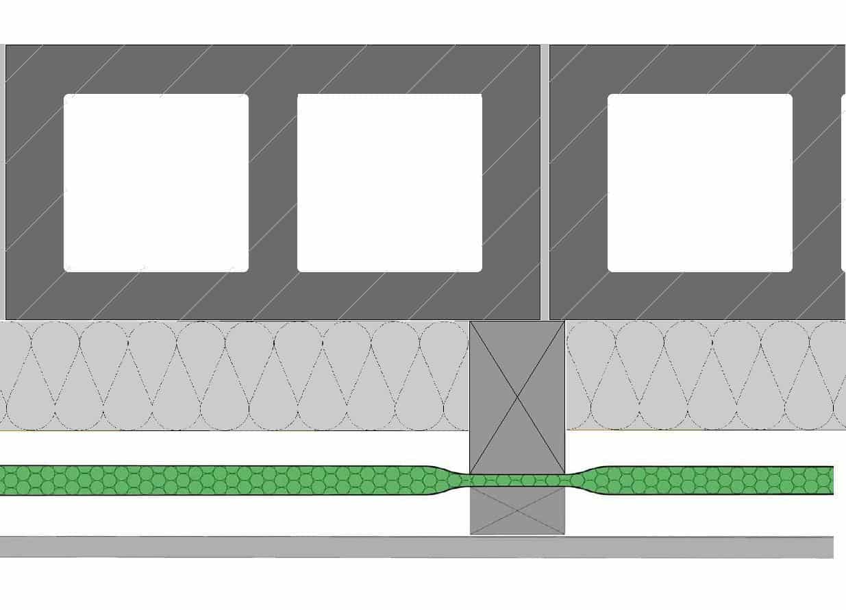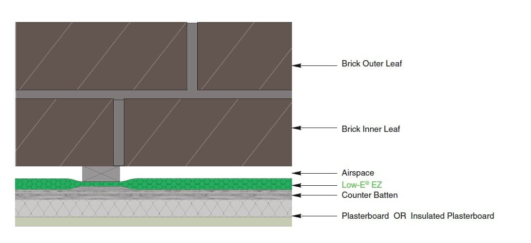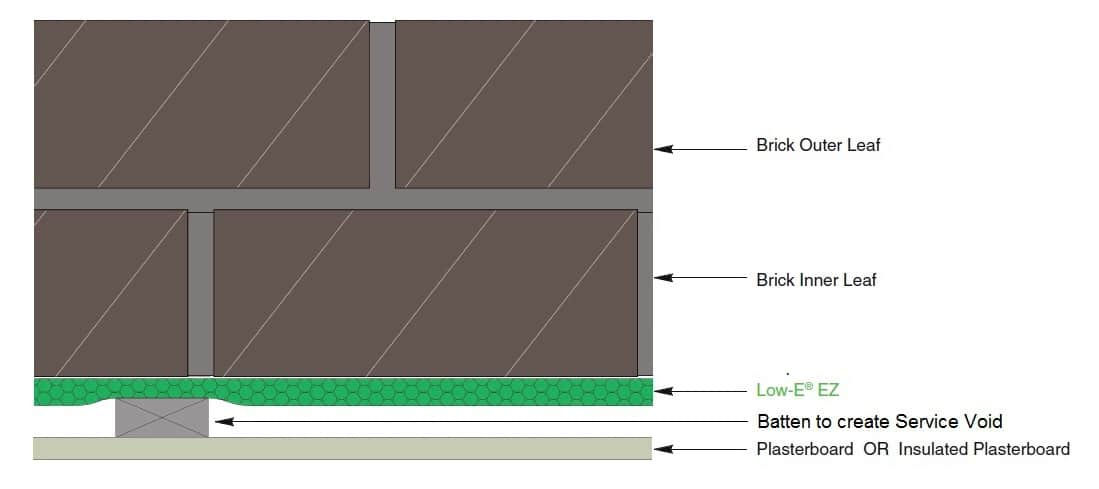 In this example, timber battens are fixed to the hollow block wall with rigid or fibre insulation installed between them. Low-E EZY Seal is fixed to battens and then a counter batten is installed to create a service void. This reduces draughts and provides maximum performance in the least space possible.