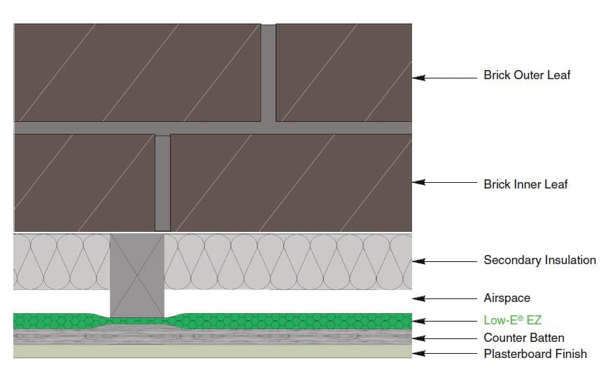In this example the wall is battened, the Low-E installed and then a counter batten. Double battening occupies additional space but also increases the thermal performance.